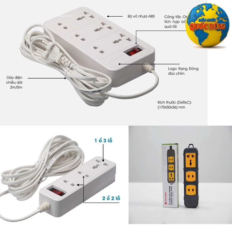 | OC06.V2 6C/5M/10A | 3 ổ 3 lỗ + 3 ổ 2 lỗ đa năng (Tổng 6 lỗ) | 205x100x36 mm | Văn phòng, khu vực cần cấp điện cho nhiều thiết bị cùng lúc. |